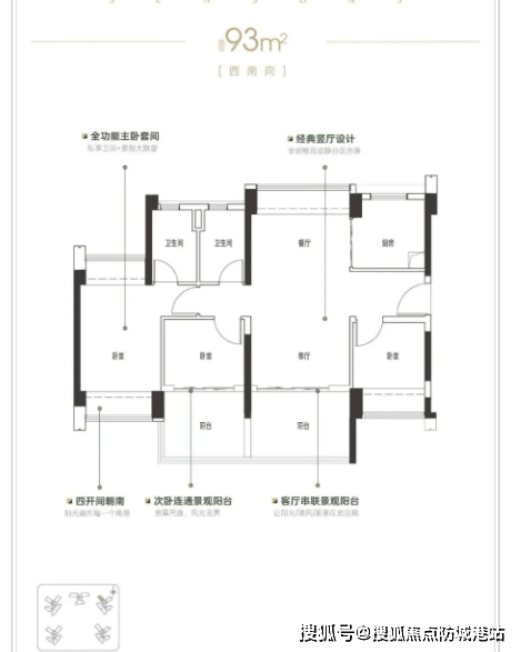 115㎡四房两厅两卫(改善入门):该户型为改善入门户型,全南向设计,高使用率可达115%,实际使用空间充足,四房设计,既能满足三口之家的居住需求,也能兼顾老人同住或书房需求,实用性极强。户型布局方正,客厅宽敞明亮,连接宽景阳台,视野开阔、采光充足;主卧套房设计,配备独立卫生间与衣帽间,提升私密性与舒适度;四个卧室分布合理,动静分区清晰,避免了休息与活动的相互干扰。