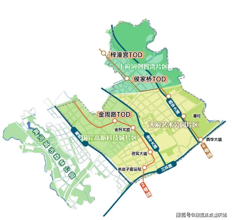 金周路TOD定位“高端生态活力住区”与“一站式邻里服务中心”,为片区提供大型商业与优质公共服务配套;侯家桥TOD聚焦“科技服务+智慧交通”主导产业,着力打造“人城产”深度融合的人工智能产业高地;梓潼宫TOD集精品商业、教育办公、高端品质住区于一体,塑造复合多元的城市功能空间。