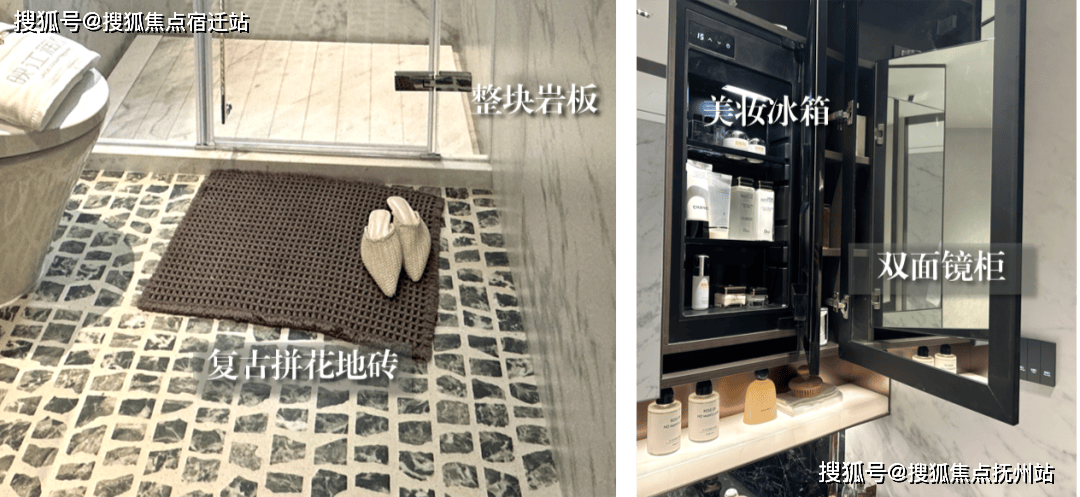 圆弧吊顶等采用弧形线条设计,卫生间标配美妆冰箱及双面镜柜,演绎海派美学精致感。